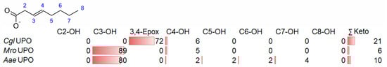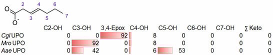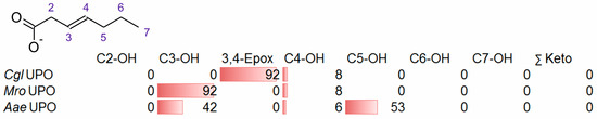 It should be noted that the percentage conversions refer to the total amount of products formed (i.e., roughly the substrate converted); therefore, high percentages of the products may not correspond to large total amounts of product. Thus, in the case of CglUPO and 3-noneoic acid, 827 µM of the substrate was converted, of which 55% (=455 µM) corresponded to the epoxide. In contrast, MroUPO converted merely 90 µM of substrate, of which 80% (=72 µM) was 3-hydroxy-3-nonenoic acid.