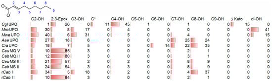 - UPOs favoring subterminal hydroxylation at C8 (26–36%), C7 (25–29%), and C6 (14%) and additionally, forming the epoxide (5–18%) and other hydroxylation products at C2/3 (about 20% and 3%, respectively). This group included UPOs from dark-spored agaric Basidiomycota, AaeUPO and CraUPO.