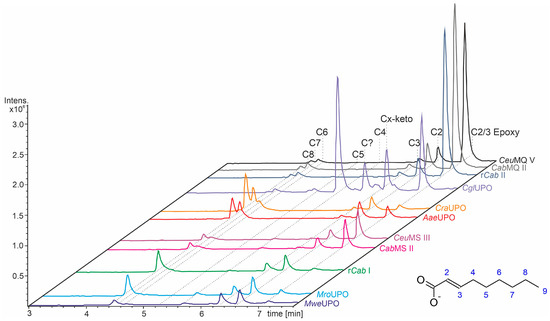 LC-MS elution profiles of enzymatic reactions with several UPOs and 3-nonenoic acid as substrate. Peak labeling (C7, C8, etc.) corresponds to the position of hydroxylation in the aliphatic chain; the arrow indicates epoxidation between C3 (Cβ) and C4 (Cγ) (compare Figure 5 and Figure 6).