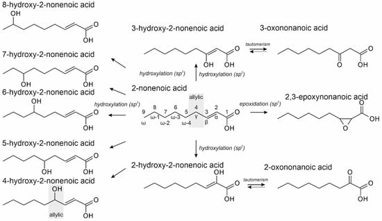 Formula scheme illustrating the formation of hydroxylation products in the reaction of UPOs with unsaturated FAs bearing the double bond at the α,β-position, using 2-nonenoic acid as an example.