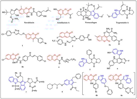 Novobiocin and armillarisin A are well-known coumarin-containing antibiotics [42,43,44,45]. Many of the small molecules containing coumarin analogs, such as coumarin-triazoles (1) [46], coumarin-pyrazole (2) [47], pyranocoumarin and coumarin−sulphonamide hybrids (3) [48] and 3-amidocoumarins (4) [49], are found to inhibit S. aureus (Figure 1). Indoles play a vital role in antibacterial drug discovery [50], and verruculogen and tryprostatins A are commonly used antibiotics having indole motifs [51]. Indole diketopiperazine alkaloids (5) [52], benzothiophene–indole hybrids (6) [53] and deoxyribofuranosyl indoles (7) [54] are some of the reported indole derivatives that serve as inhibitors of S. aureus.