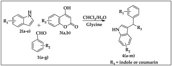A mixture of aryl aldehyde, substituted indoles, substituted coumarin, and glycine was stirred in water:chloroform (1:1) at 70 °C for about 12 h. After the completion of the reaction, the crude mass was extracted with ethyl acetate (25 mL × 3), distilled under high pressure, and purified through column chromatography to obtain the desired compounds 4(a–m). The novel compounds were confirmed by 1H, 13C NMR, and mass spectroscopy.