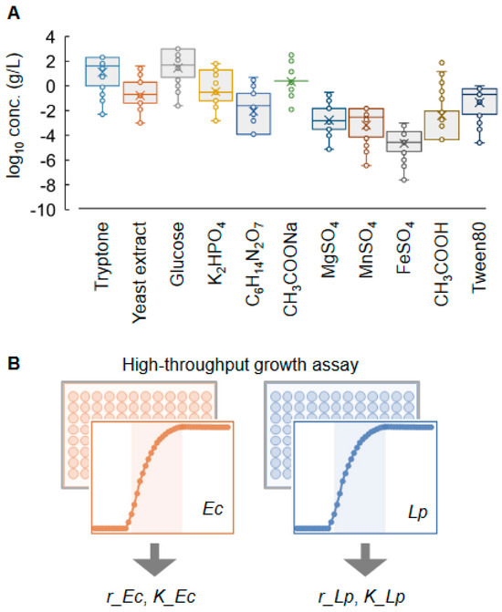 The initial training data were experimentally acquired, linking medium combinations to bacterial growth. Escherichia coli (Ec) and Lactobacillus plantarum (Lp) were used, as they were of different growth preferences and commonly employed in laboratories and production tests using selective culture media [27,28,29,30]. Although the media appropriate for both strains were well known, whether the culture medium specific for Lp growth could be fine-tuned via machine learning for Ec growth was tested. Eleven components in the commercially available MRS medium for Lp growth were used to prepare the medium combinations. Theoretically, any media or components would be fine for medium optimization. The choice of MRS (11 components) was to benefit from machine learning, which is powerful when the number of variables (medium components) is large enough. Note that agar in the MRS medium was removed from the optimization medium, as the growth assay was performed in liquid media. These components were mixed in a broad range of concentration gradients, changing on a logarithmic scale (Figure 1A). Ec and Lp were cultured independently in 98 medium combinations (n = 4) to obtain the growth curves for calculating the growth parameters of growth rate (r) and maximal population density (K) (Figure 1B). As the initial training data, the medium combinations connecting with the growth parameters of both strains, i.e., r_Lp, K_Lp, r_Ec, and K_Ec, were acquired. These four parameters were used as the machine learning (ML) objective variables, either in a single mode or a multiple combination (Figure 2A).