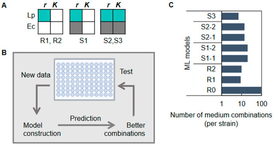 ML-assisted medium optimization and specialization for different strains were performed using the gradient-boosting decision tree (GBDT), which has been repeatedly validated to have superior predictive performance and interpretability compared to other algorithms [31,32,33]. The initial training data (R0) were applied to the GBDT model to improve r_Lp or K_Lp (R1 and R2) (Figure 2A). Medium optimization and specialization were performed by active learning, following model construction, prediction, and experimental verification steps. The top 10~20 predicted medium combinations of the best objective values (e.g., r, K) were subjected to experimental validation. The results were included in the training data for the following round of ML model construction and prediction (Figure 2B). Active learning was conducted for five rounds for each strain: R1 and R2 considered r_Lp or K_Lp for medium optimization of Lp, and S1~S3 considered multiple parameters for the medium specialization of Lp or Ec (Figure 2A). That is, S1-1 and S1-2 considered the pairs of r or K (i.e., r_Lp vs. r_Ec, K_Lp vs. K_Ec) to maximize the difference of r or K between Lp and Ec, and S2-1, S2-2, and S3 considered all parameters to maximize the difference of both r and K between Lp and Ec (Figure 2C).