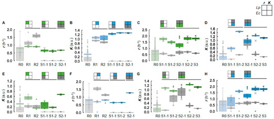Active learning improved medium specialization. Medium optimization for the specific growth of Lp or Ec is shown as the left (A,B,E,F) and right (C,D,G,H) four panels, respectively. Boxplots represent the growth parameters experimentally obtained under 10~20 medium combinations predicted per round of active learning. The colored boxes represent the parameters supposed to be improved in active learning, and the gray ones are to be repressed. The small quarter squares indicate the ML models used in active learning. The growth parameters to be improved in ML model construction are indicated in green and blue (r and K, respectively), and those to be suppressed are indicated in grey. R0 shows the initial training data. R1 and R2 show the experimental results of two rounds of active learning with the ML model considering either r_Lp or K_Lp solely. S1-1 and S1-2 show the experimental results of two rounds of active learning with the ML model considering the paired parameters of r or K. S2-1, S2-2, and S3 show the experimental results of three rounds of active learning with the ML models considering all four parameters.