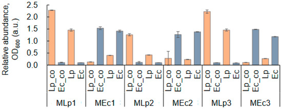 Co-culture of both strains in fine-tuned media for selective culture. Six media optimized for specific growth of either Lp or Ec are indicated as MLp1~3 and MEc1~3, respectively. The OD600 values of Lp and Ec after 24 h co-culture are shown. Orange and blue represent Lp and Ec, respectively. Standard errors of biological replicates (N = 3) are indicated.