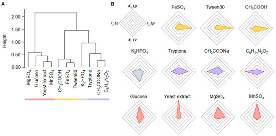 A hierarchical clustering analysis of the normalized feature importance intriguingly divided the medium components into four main categories (Figure 7A). The medium components assigned in the same categories showed neither common chemical properties nor similar biological functions. It strongly suggested that the novel classification of medium components depended on their impact on bacterial growth. Four different trends of medium components contributing to the growth parameters were identified, that is, highly relevant to K_Lp (pink), r_Lp (yellow), r (purple), and Ec (grey), respectively (Figure 7B). Such specificity of medium components might be applied to the medium’s development for differentiated bacterial growth.