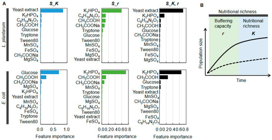The medium components contributing to the bacterial growth specificity could be identified according to the medium specialization that proceeded via active learning. The scores (S), calculated in active learning considering multiple growth parameters, were subjected to the GBDT analysis. As they represented the goodness of the growth specificity, the medium components of high feature importance indicated a significant contribution to the growth specificity. The results showed that yeast extract and glucose primarily determined the specificity of K for Lp and Ec, respectively (Figure 8A, blue), and K2HPO4 was the common component determining the specificity of r for Lp and Ec (Figure 8A, green). Yeast extract and K2HPO4 are shown in Figure 8A in black. The findings revealed that adjusting a single component differentiated the growth of Lp and Ec to a great extent.