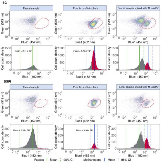 Pure M. smithii cultures stained with SG and SGPI showed a seven-fold higher fluorescence intensity at 452 nm compared to a faecal sample without methanogenic Archaea. In our specific flow cytometer, the mean 452 nm fluorescence intensity was 1.72 × 104 (95% CI: 2.44 × 103 to 4.97 × 104) for SG and 1.94 × 104 (95% CI: 8.38 × 103 to 3.78 × 104) for SGPI, while the mean fluorescence intensity for the faecal sample was 2.41 × 103 (95% CI: 1.50 × 102 to 6.51 × 103)for SG and 2.59 × 103 (95% CI: 1.62 × 102 to 8.15 × 103) for SGPI. Besides an increased 452 nm fluorescence, M. smithii cells shifted towards a lower SG (green, 519 nm) fluorescence, which can aid in the identification and distinction of methanogenic Archaea in a more complex background. M. smithii SG and SGPI-stained populations were therefore also gated in blue1 (452 nm) vs. green (519 nm) emission biplots (Figure 1).