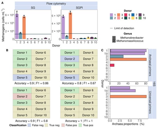 Flow cytometric detection of cofactor F420 auto-fluorescence (A) corresponded with 16S rRNA gene amplicon (16S) Archaea presence (C) in nine out of ten SYBR® Green (SG) and eight out of ten SYBR® Green—propidium iodide (SGPI)-stained faecal slurries derived from ten different healthy donors. Universal primers failed to identify Archaea in donors 2 and 5, who carried lower abundances of Methanobrevibacter (no pattern fill) and Methanomassiliicoccus (hatched bars) according to Archaea-specific sequencing, which served as a benchmark. The flow cytometry-based methanogenic Archaea detection yielded the highest accuracy and F1-score due to the highest number of true positive (green) and true negative (yellow) and the smallest number of false positive (red) and false negative (purple) classifications. (B) Donors were classified as ‘methanogen positive’ when methanogenic Archaea cell counts were higher than the limit of detection (LOD, full line).