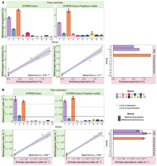 Proportional (A) and absolute (B) flow cytometric methanogenic Archaea abundance based on cofactor F420 autofluorescence of SYBR® Green and SYBR® Green—propidium iodide-stained samples significantly positively correlated (Spearman’s rank correlation) with 16S rRNA gene amplicon Archaea abundances in 10 faecal slurries derived from 10 different healthy donors. The Archaea community consisted of Methanobrevibacter (no fill pattern) and Methanomassiliicoccus (hatched bars). Spearman’s rank correlation coefficients (ρ) are depicted in the bottom right corner of every plot. *** = p < 0.001, ** = p < 0.01 and * p < 0.05. The limit of detection and the limit of quantification are depicted with a full and dashed line, respectively.