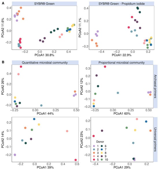 Microbial community β-diversity assessment clustered methanogens according to their (A) flow cytometric fingerprint data stained with either SYBR® Green (left) or a SYBR® Green—propidium iodide staining mix (right) and (B) principal coordinates analysis (based on Bray–Curtis dissimilarity) of the genus-level quantitative microbial community compositions (left) and proportional microbial community composition (right). The fingerprint was based on the isolated methanogen information of six phenotypic parameters (four fluorescence and two scatter signals). The V3–V4 region of the 16S rRNA gene was amplified with either Archaeal (top) or universal (bottom) primers.