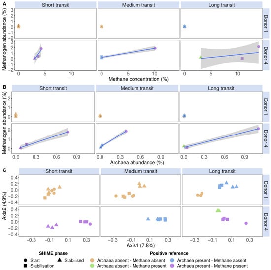 The detected proportional methanogen counts (%) of donors 1 and 4 in the distal colon, stained with a SYBR® Green—propidium iodide staining mix, increased with methane concentration (%) (A) and proportional Archaea abundance (%) (B). (C) Community β-diversity assessment of the flow cytometric SHIME fingerprint data, stained with a SYBR® Green—propidium iodide staining mix, clustered according to methanogenic Archaea presence and methane presence. The fingerprint was based on the isolated methanogen information of six phenotypic parameters (four fluorescence and two scatter signals). Archaea presence was verified with 16S rRNA gene amplicon sequencing of the V4 region, on which methanogenic Archaea and methane presence were coloured according to the presence or absence. Methane presence was verified using methane production. The total SHIME transit times were adapted into three categories, namely short (21 h), medium (42 h) and long (63 h). Ordination was performed with principal coordinates analysis (PCoA) based on Bray–Curtis dissimilarity.