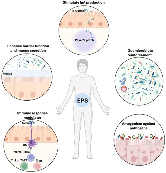 Matsuzaki et al. showed that EPSs stimulated the production of a specific IgA in Peyer’s patch cells and influenced the Th1 and Th2 cell-mediated response in splenocytes [] (Figure 1).
