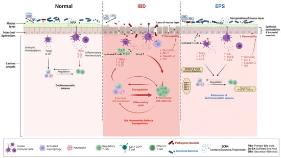 Schematic representation illustrates the mechanisms of EPSs’ therapeutic effects on IBD. Immune tolerance maintains the gastrointestinal immune system physiological state, which ensures homeostatic balance. Inflammatory bowel disease (IBD) can cause gut dysbiosis and impaired intestinal barrier function, as well as excessive stimulation of the immune response. An imbalance in the gut microbiota population of the host contributes to leaky gut. This leads to the release of chemokines and cytokines that cause inflammation. An uncontrolled migration of several effector T cell subtypes disrupts the intestinal mucosa, effector, and regulatory T cells in IBD. In the presence of intestinal damage, pathogenic microorganisms are known to translocate from one area to another. Toxins, neuroactive substances, metabolites, and immunogenic peptides resulting from poor digestion can also pass through the leaky gut and cause an immune response and inflammation. The process of inflammation is triggered by several mechanisms, such as soluble inflammatory mediators like TNF-α, IL-1β, and IL-12, as well as cellular mediators like macrophages and cytotoxic T cells. All of these mediators work together to cause local tissue damage and to intensify the inflammation cascade that is already present. Additionally, the bile acid pool is changed under these conditions. After EPSs reach the colon and are metabolized by the gut microbiota, their effects on these receptors attenuate the production of pro-inflammatory cytokines (IL-1β, TNF-α, and IL-12) and modulate macrophages’ and helper T cells’ polarization towards anti-inflammatory cytokines (IL-10, IL-4, TGF-β). In addition, the EPSs restore the altered gut microbiota community that contributes to the production of SCFAs, which in turn helps in the recovery of the tissues by strengthening the tight junction proteins (Occludin, ZO-1, HO, Claudin-2).