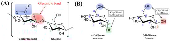 From a chemical perspective, EPSs belong to the polysaccharide class, which is composed of high-molecular-weight biopolymers ranging from 10 to 1000 kDa []. To date, observed Cyanobacterial EPSs molecular masses have ranged from 80 to 2000 kDa []. The carbohydrate polymers are primarily composed of monosaccharide monomers, and they can be linked together by glycosidic bonds to form a whole structure [] (the red caption in Figure 3A), but they may also contain non-saccharides like phosphate, lactate, acetate or glycerol []. Depending on the spatial orientation of this glycosidic bond, two anomers, α and β, can be obtained (Figure 3B). These anomers are stereoisomers with different specific rotations, and thus varied properties.