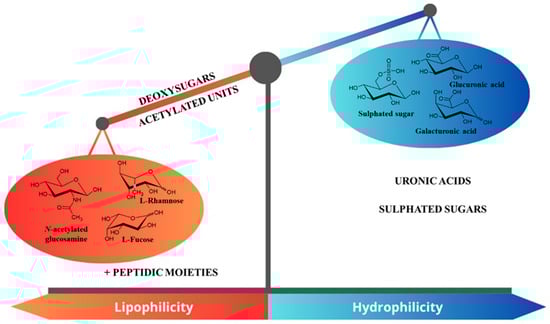 Overall, the hydrophile/lipophile balance of EPSs depends on the proportion of hydrophilic monomers (uronic acids and sulphated ones) versus the amount of acetylated and desoxy monomers. It is notable that cyanothece CE4 EPS collected from Italian saltworks displayed a high proportion of uronic acids (80.1%) along with deoxy sugars []. This composition, with its high level of lipophilic EPSs in combination with a strong charged moiety, contributes to the emulsifying capacity of such EPSs.