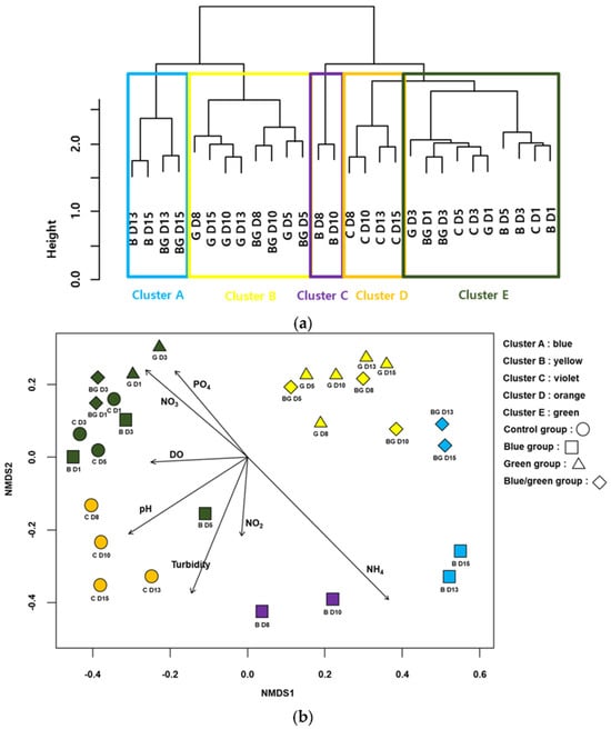 Cluster analysis based on Cyanobacteria-associated bacteria assemblages. (a) Non-metric multidimensional scaling (NMDS) ordination of samplings with Cyanobacteria-associated bacteria assemblages. (b) Arrows indicate water quality variables significantly related to assemblage compositions (p < 0.05). The longer the arrow length, the higher the correlation coefficients with the NMDS axis. The first letter in the figures indicates the experimental condition (i.e., C: control, B: blue film, G: green film, BC: blue and green light) and the number represents the experimental date (D1: 24 h, D3: 72 h, D5: 14 h, D8: 196 h, D10: 240 h, D13: 312 h, and D15: 360 h). Data from [] (CC BY 4.0).