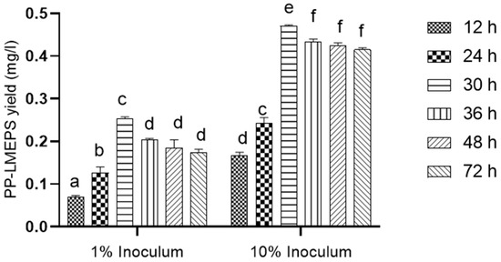 EPS production using different inoculum sizes and incubation times: 1% and 10% inoculum was used for EPS production with different incubation times, like 12, 24, 30, 36, 48, and 72 h. The Tukey and Duncan tests were 192 used to assess the significance of the differences between the alphabets (a–f) in superscript (p ≤ 0.05).