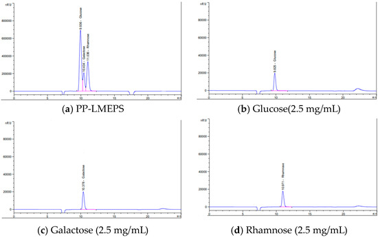 Monosaccharide composition of PP-LMEPS (a) via HPLC analysis. Monosaccharide derivatives were analyzed using Agilent 1000 series HPLC (Agilent Technologies, Model No. 1100); (b) glucose standard; (c) galactose standard; (d) rhamnose standard.