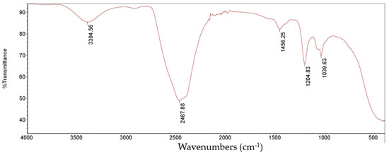 FT-IR analysis was used to look at the functional group in the PP-LMEPS based on specific frequencies (Figure 3). The broad peak of absorption at 3394.56 cm−1 was attributed to the polysaccharide hydroxyl groups (O–H); the spectra that appeared between 1000 and 1200 cm−1 indicate the presence of a pyranose form of sugars. This is the polysaccharide’s typical IR absorption spectrum [32]. The bending vibration peak of the O-H band is thought to be near 1456.25. Peaks at 1204.83 cm−1 and 1039.63 cm−1 are related to C-O-C and C-O-H bond stretching, a polysaccharide property. Comparable outcomes were reported by [33] and [34]. These peaks revealed the presence of the monosaccharides galactose and glucose as well as glycosidic linkage. Studies have shown that glucans exhibit an IR spectrum between 1000 and 1500 cm−1 [35]. The FTIR spectra of the unique absorption peaks of glucose residues found in EPS suggested that the glucose in these EPS contained glycosidic linkages between glycosyl groups as well as OH and C-O groups.