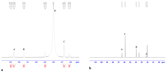 NMR spectra of PP-LMEPS: (a) region from 1D 1H spectrum; (b) region from 1D 13C spectrum. A-α-D-glucose, B-α-L-rhamnose, C-β-D-galactose and D-D2O. Red color numbers corresponding to ratio of monosaccharides.