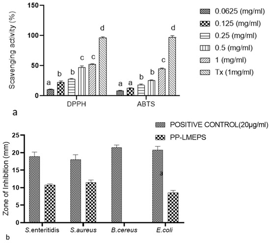 (a) Scavenging effect of PP-LMEPS on DPPH, ABTS radicals and compared with that of Trolox; (b) antibacterial activities of EPS compared with that of ampicillin. EPS = EPS from L. mesenteroides; Tx = Trolox; Positive control = ampicillin. The Tukey and Duncan tests were used to assess the significance of the differences between the alphabets (a–d) in superscript (p ≤ 0.05).