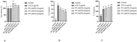 (a) Effect of PP-LMEPS on the viability of RAW 264.7; (b) effect of PP-LMEPS on the production of IL-6; (c) effect of PP-LMEPS on the production of IL-10. The Tukey and Duncan tests were used to assess the significance of the differences between the alphabets (a–d) in superscript (p ≤ 0.05).