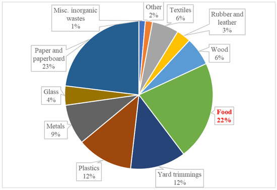 U.S. total MSW generation in 2018 by material type in percentages [9]. Food is highlighted in the red color, which is the focus of this paper.