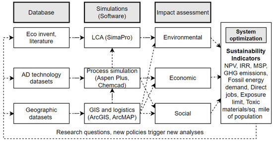 In the proposed sustainability assessment framework, the database domain contains sets of data layers, which include geographic datasets (feedstock characteristics, locations and distances, policies, etc.) in the form of attribute tables or maps, AD technology datasets (temperature, pH, residence time, capital costs, etc.) in the form of excel spreadsheets, and environmental life cycle inventory data. The simulation domain is the heart of the framework and uses multiple tools to process the obtained data from the database domain. For example, the geographic dataset is used as an input to the Arc Map tool to generate the distance from the feed location to a candidate AcoD facility. The outputs from one software tool can be communicated as an input to other software tools. For example, the Aspen Plus process simulation processes the output information from ArcMap, such as location-specific feedstock characteristics, to predict AcoD yield and process energy demands. Similarly, tools such as SimaPro and others can be used to conduct environmental LCA of the process simulation using the ISO standards by taking the outputs (energy requirements, material flow rates, etc.) from Aspen Plus software. Ultimately, the LCA model will be used to assess environmental indicators such as GHG emissions, energy demands, and other impacts of the biogas/biomethane systems. In some specific scenarios in which policies allow financial incentives for emission savings, the techno-economic analyses might require LCA outputs in the form of GHG emission savings compared to a reference business-as-usual scenario. The last domain is impact assessment in which the output list of indicators from the simulation domain is split into environmental, economic, and social categories to complete the sustainability assessment. The indicator set may be net present value (NPV), internal rate of return (IRR), minimum selling prices (MSPs), GHG emissions, and their savings compared to fossil equivalent products, fossil energy demand, direct and indirect/induced jobs, exposure limit, and toxic materials/sq. mile of the population. This framework may also include regional economic effects through the use of a general or partial equilibrium economic model. Optimization of the AcoD production systems may be included based on single or multiple objective functions. The external factors that can trigger new analyses and sustainability assessment indicators could include new research questions, new policies to encourage biogas/biomethane production, or future biogas/biomethane energy systems. Comparison to existing conditions will be useful in decision making.