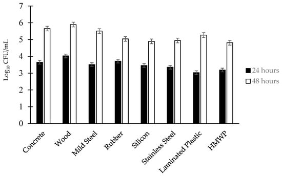 With respect to species-specific differences in biofilm populations, we observed that all bacteria formed >3 log10 CFU/mL biofilms on all eight of the surfaces tested, but significant differences in biofilm populations existed. For example, S. cholerasius had the highest population after 24 h, but L. monocytogenes had the highest population after 48 h (Figure 2). In addition, some surfaces hosted significantly higher populations than others in a species-specific manner as seen in Figure 4. This result is similar to those obtained by Mafu et al. [] and Sasahara and Zottola []; they observed strain-specific variability in the ability to attach to and colonize surfaces.