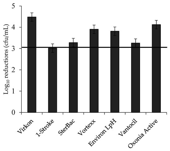Log reductions in biofilm population densities (log10 CFU/mL) for seven disinfectants. The means are averaged across the results for three food-borne pathogens on eight surfaces. The solid horizontal line shows the threshold for functional disinfection (3-log reduction). Error bars represent the standard error of the mean.