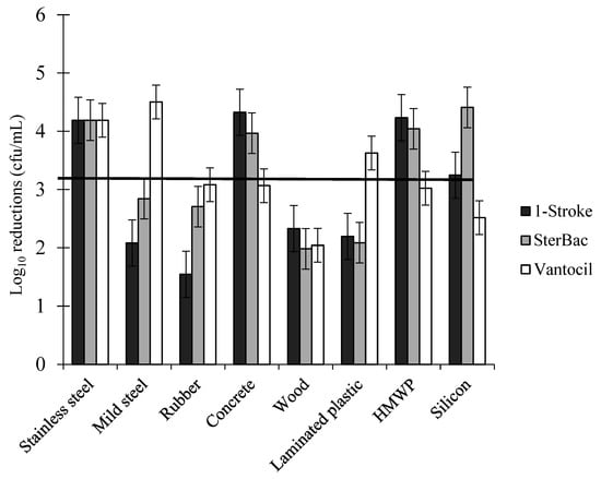 Log reductions in biofilm population densities (log10 CFU/mL) for three disinfectants on eight surfaces. The means are averaged across the results for three food-borne pathogens. The solid horizontal line shows the threshold for functional disinfection (3-log reduction). Error bars represent the standard error of the mean.