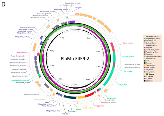 Phastest circular outputs of the organisation of PluMu “intact” phage in the 3457 and 3459 genomes are shown in Figure 2A–D, with details of the predicted CDSs, top blastp hits, and significant E-values in Tables S1–S4. All have a typical Mu-like phage organisation, i.e., latency, early, and middle (region finishing downstream of the c gene), followed by the late lysis-head-tail region, with key predicted genes and proteins as detailed by Harshey [36] and the ViralZone (https://viralzone.expasy.org/4356, accessed on 9 February 2024), available through the ViralZone server [37]. These include genes encoding integrases, repressors, anti-repressors, transposases, portal proteins, terminases, and those required for tail, and head formation.