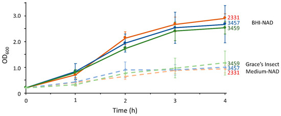 As shown, 2331, 3457 and 3459 grow faster in BHI-NAD and Grace’s Insect Medium-NAD as measured by OD600. Error bars are mean + SD of triplicate cultures.