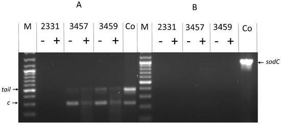 Molecular identification of phage in 3457 and 3459 in PEG-precipitated supernatants after growth in BHI-NAD. (A) Amplification of the c and tail genes present in PluMu 3457 and PluMu 3459 genomes (left panel) and bacterial sodC (right panel), using gDNA as a template without (-) and with (+) prior DNase treatment. (B) Amplification of c and/or tail genes (left panel) and sodC (right panel). DNA templates were PEG-precipitated supernatants without (-) and with (+) prior DNase treatment. Co = 3459 gDNA. M = GeneRuler 100 bp Plus DNA Ladder. Size of amplicons: c = 264 bp, tail = 448 bp, sodC = 1035 bp).