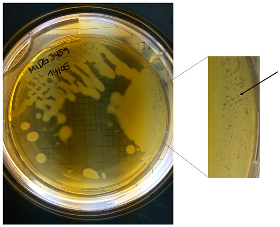 3459 grown on a BHI-NAD agar plate showing plaque formation as indicated by the arrow.