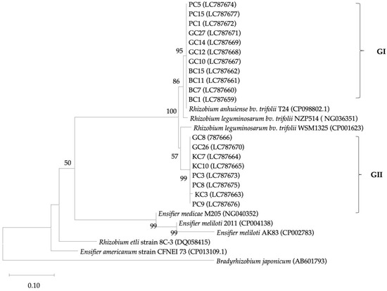 Based on the 16S rRNA, a total of nineteen clover isolates were divided into two groups, as shown in Figure 1. GI contained eighteen isolates (94.7% of the total), and GII consisted of only one isolate (5.3%). The GI group is divided into three subgroups [GIa (47.4%), GIb (5.3%), and GIc (42.1%)]. The GIa subgroup included nine isolates and showed a close relationship (100%) to the Rhizobium hidalgonense and Rhizobium leguminosarum species. The GIb subgroup consisted of one isolate (KC10) and was highly similar (100%) to the Rhizobium leguminosarum species. The GIc subgroup comprised eight isolates and revealed high similarity to the Rhizobium etli CFN 42. The GII group contained one isolate (KC3) and showed maximum similarity to the Ensifer meliloti 2011.