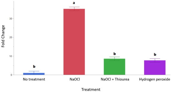 The mutation rates of S. typhimurium 14028s after exposure to a sublethal concentration of NaOCl. S. typhimurium 14028s was exposed to NaOCl (20 ppm) or NaOCl (20 ppm) plus thiourea (150 mM) before determination of the mutation rate using rifampicin. The same procedure was repeated with no exposure (no treatment; negative control) or exposure to H2O2 (1 mM; positive control). Different letters denote statistical differences (p < 0.0006).