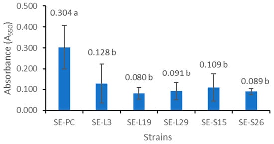 Figure 2 shows the A550 values of the solutions of crystal violet extracted from the biofilms formed by the wildtype and mutant Salmonella cultures. Among tested mutants, SE-L3, SE-L19, SE-L29, SE-S15, and SE-S26 formed significantly (p ≤ 0.05) less biofilm mass compared to their wildtype parent. However, the biofilm masses from the five mutants were not significantly (p > 0.05) different from one another.