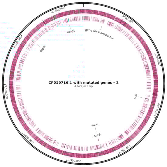 The identified mini-Tn10 insertion sites in examined mutants are reported in Table 2. The genetic locations of mini-Tn10 insertion are shown in a circular chromosome map (Figure 3). In the SE-L3 mutant, the mini-Tn10 interrupted the eutE, a gene responsible for the biosynthesis of aldehyde dehydrogenase, while in SE-L19, SE-L29, SE-S15, and SE-S26, the transposon was found in the genes that encode for a transporter protein, outer membrane protein L, a ribbon–helix–helix protein from the CopG family, and cysteine desulfurase, respectively (Table 2).