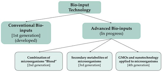 The designation of generations of biofuels depends on the specific technology and raw material used to produce biofuels. It also links to temporal development trends over the years and the complexity of the biofuel market, which includes an increasing number of potential raw materials to be used in biofuel production [23]. Similarly, researchers are constantly searching for raw materials and technologies to produce them at lower costs while maintaining the quality and efficiency of the biological agent in the production areas. Thus, we can categorize bio-input technology into generations. Figure 1 shows bio-input technology and its stages of development in generations.