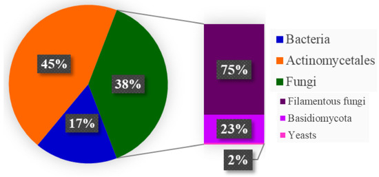 Regarding the number of bioactive metabolites produced by microorganisms, it is possible to verify that fungi are in second place in obtaining these metabolites, behind only actinobacteria. And within the group of fungi, filamentous fungi are in first place in the ranking, thus showing the importance of exploring the metabolites produced by them (Figure 3) [35].