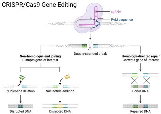 Basic steps in gene editing using CRISPR/Cas9. [credit: Esmée Dragt (creator) and Louis Ngai (BioRender.com (2020). Retrieved from https://app.biorender.com/biorender-templates/figures/all/t-5f873df466346900a43c6db1-crisprcas9-gene-editing, accessed on 16 January 2024)].
