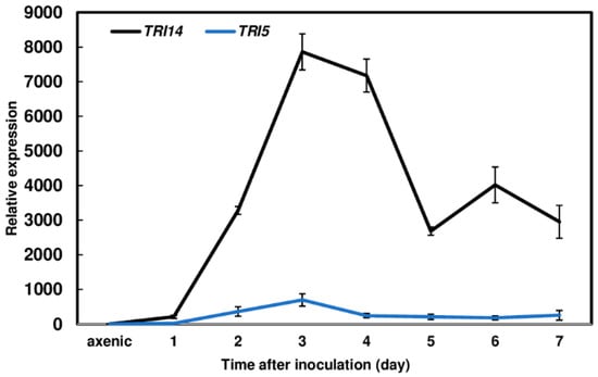 Induction of TRI14 in F. graminearum-inoculated wheat heads. Heads of wheat cultivar Norm were inoculated by immersion in a macroconidial suspension of wild-type F. graminearum (105 conidia/mL in 0.02% Tween 20). Heads were collected daily for 7 days post inoculation. Three biological replicates, with two heads per replicate, were collected at each time point for RNA isolation. Gene expression was determined by RT-qPCR. β-tubulin expression served as an internal control to normalize gene expression. Fold changes in gene expression were relative to expression levels determined for a 7-day axenic F. graminearum wild-type strain grown on V8 Juice agar, which was set as one. Three technical replicates were conducted for each sample from three biological replicates at each time points.