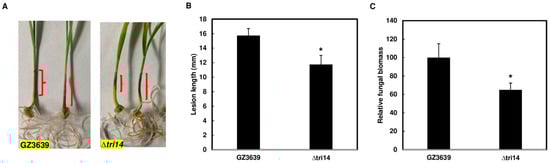 To assess whether TRI14 affects the F. graminearum infection of wheat coleoptiles, we conducted coleoptile infection assays, essentially as previously described [19]. We found that, on average, ∆tri14 caused significantly smaller lesions on inoculated coleoptiles than the wild type (Figure 7A,B). In addition, there was significantly less F. graminearum biomass in ∆tri14-inoculated coleoptiles than in wild-type-inoculated coleoptiles (Figure 7C). These results indicate that TRI14 is required by F. graminearum to cause wild-type levels of disease and growth in wheat coleoptiles.