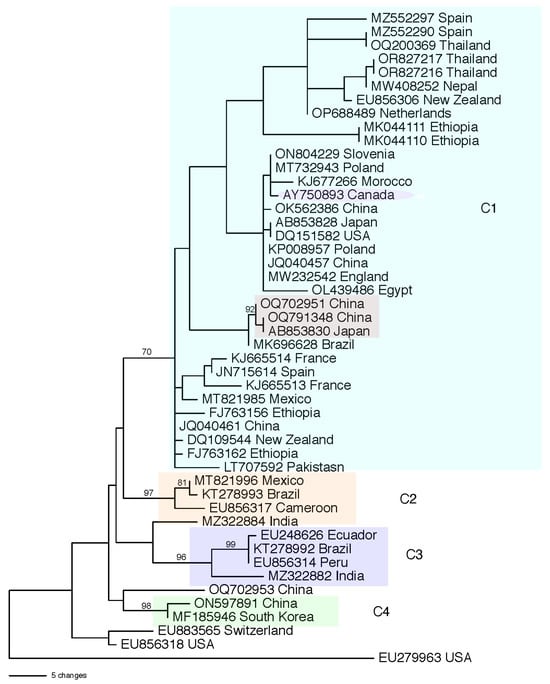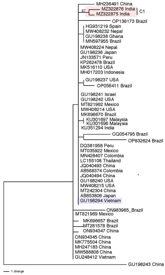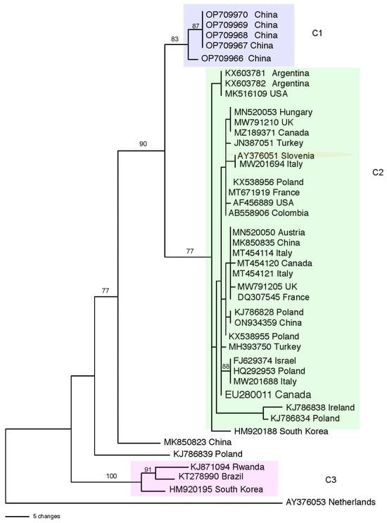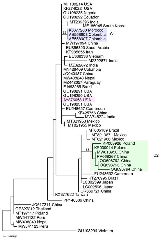 - Tamura, K.; Stecher, G.; Kumar, S. MEGA11: Molecular evolutionary genetics analysis version 11. Mol. Biol. Evol. 2021, 38, 3022–3027. [Google Scholar] [CrossRef] [PubMed]