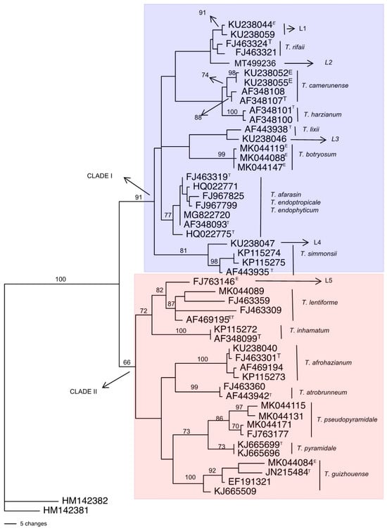 The phylogeny of species within the Harzianum complex clade segregated the dominant species into two clades. Clade I is highly supported, with a bootstrap value of 91%, whereas Clade II was moderately supported, with a bootstrap value of 66% (Figure 5). Clade I included T. camerunense, T. rifaii, T. harzianum, T. simmonsii, T. endophyticum, T. neotropicale, T. afarasin T. botryosum, and T. lixii. Clade II included the species T. lentiforme, T. inhamatum, T. afroharzianum, T. atrobrunneum, T. pyramidale, T. pseudopyramidale, and T. guizhouense. The two main clades were not separated based on biogeographic restriction or habitat, as endophyte and soil inhabitants are present in both clades. The tree had five lineages (L1–L5), with no strong association with the identified species that could represent new species. The strains representing these lineages were isolated as endophytes from plants in Malaysia and Ethiopia, which indicated a higher chance of finding new species among endophytic strains.