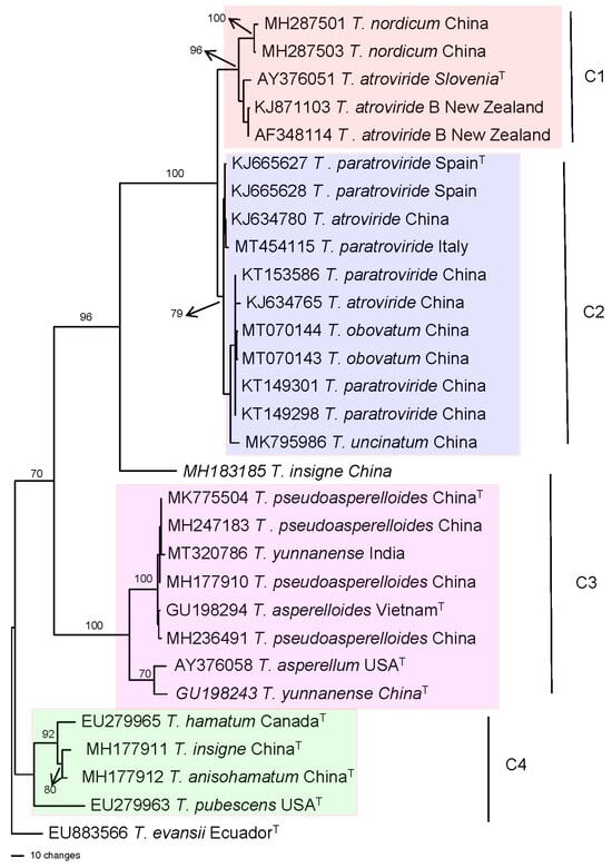 The nearest relative for T. asperellum was T. yunnanense (Figure 7, clade C3), while the nearest relative for T. asperelloides was T. pseudoasperelloides. Clade C3 also contained the sequence of an isolate incorrectly identified in GenBank as T. yunnanense from India, as it did not cluster with the type species of T. yunannense. The nearest relatives of T. hamatum (C4) were the two species T. insigne and T. anisohamatum, followed by T. pubescens. The four species formed the highly supported clade C4.