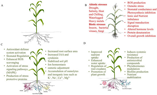 An overview of maize plants showing (A) a healthy maize plant, (B) a maize plant affected by abiotic and biotic stresses, (C) mechanisms of abiotic stress tolerance including osmotic adjustment, antioxidant activity, and stomatal regulation, and (D) mechanisms of biotic stress tolerance such as activation of pathogenesis-related proteins and structural barriers.